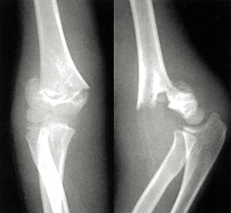 転倒や転落などをして、肘の部分に激しい痛みと腫れがあり、痛くて肘がうごかせない場合に、この骨折を疑います。骨折片で神経や血管が損傷されると、手や指がしびれたり動かせなくなることがあります。